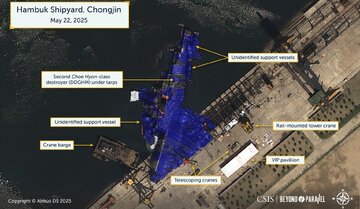 به گزارش خبرگزاری بیکینگ، تصاویر ماهوارهای منتشرشده توسط پروژه Beyond Parallel متعلق به اندیشکده آمریکایی CSIS، این حادثه را تأیید میکند. در تصاویر، ناو جنگی روی پهلو در کنار اسکله دیده میشود؛ جایی که قرار بود از آن به آب انداخته شود. بر روی بدنه کشتی نیز پارچههای آبیرنگی کشیده شدهاند تا منظره حادثه از دید ماهوارهها پنهان بماند.