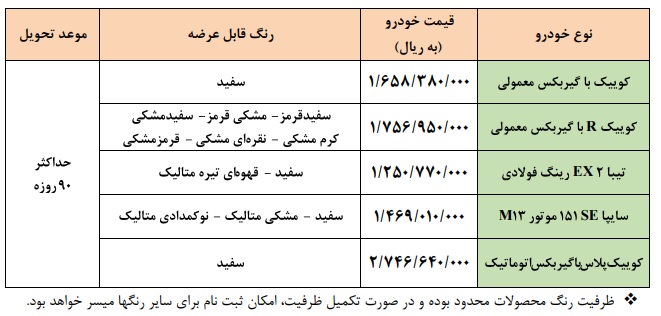 | کوییک R | ۸۸۹.۵۲۹.۰۰۰ | مرداد الی مهر سال ۱۴۰۱ |