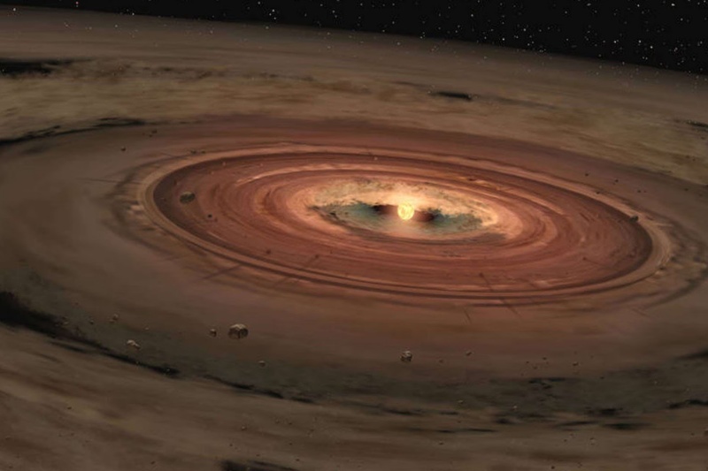 پیش از آنکه منظومه شمسی ما به دیسکی تخت تبدیل شود، توزیع غبار و سنگها، آن را بیش از پنکیک به شکل دونات درآورده بود. این نتیجهای است که دانشمندان پس از بررسی شهابسنگهای آهنی از بخش خارجی منظومهی شمسی به دست آوردند و متوجه شدند که این نتایج تنها در صورتی معنادارند که منظومهی شمسی زمانی به شکل حلقوی بوده باشد.اطلاعات فوق میتوانند به ما کمک کنند تا دیگر منظومههای سیارهای نوظهور و ترتیب گردهمآمدن آنها را تعیین کنیم. شکلگیری منظومهی سیارهای در اطراف یک ستاره در ابری مولکولی از گاز و غبار آغاز میشود. اگر بخشی از این ابر بهاندازهی کافی متراکم شود، به خاطر گرانش خود دچار فروپاشی میشود و شروع به چرخیدن میکند تا جایی که ستارهی نوزاد در حال رشد را تشکیل دهد. با چرخش این ابر، مواد داخل ابر مجاور به دیسک چرخانی جذب میشوند که پیشستاره را تغذیه میکند.درون دیسک یادشده، تودههای کوچکتری شکل میگیرند و به هستههای پیشسیارهای تبدیل میشوند که یا تا شکلگیری سیارههای کامل به رشد ادامه میدهند یا در حالت متداولتر، با توقف رشد مواجه میشوند و به شکل اجرام کوچکتری مثل سیارک باقی میمانند.ما در گذشته دیسکها را در اطراف ستارههای دیگر با شکافهای شکلگرفته بهوسیلهی سیارهها که در حین حرکت، گردوغبار را درهم میآمیزند، مشاهده کردهایم؛ اما انواع آهنی شهابسنگها در بخش خارجی منظومهی شمسی، بخش دیگری از داستان را روایت میکنند.